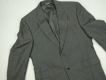 Męska marynarka w odcieniu szarości z delikatnym prążkiem. - Krój: klasyczny, zapinana na 2 guziki - Kołnierz: klapy otwarte (notch lapel) - Kieszenie: dwie dolne z patkami, jedna brustasza, dodat...