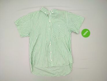 Koszula męska w paski – krótki rękaw - Wzór: pionowe paski w kolorach zielonym i jasnoróżowym - Krój: klasyczny kołnierzyk, zapięcie na guziki z przodu - Kieszenie: jedna kieszeń na piersi z patką...Stan: