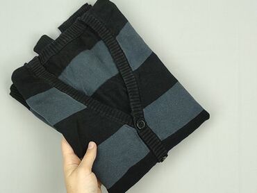Dzianinowy kardigan w paski S/M - Kolor: czarno‑białe, drobne poziome paski - Krój: dopasowany, z szerokim, zaokrąglonym dekoltem - Rękaw: 3/4 z czarnymi, prążkowanymi ściągaczami - Zapięcie: na c...