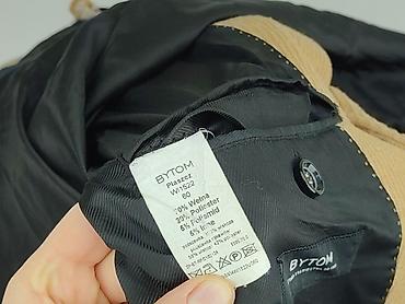 Męski płaszcz BYTOM, model W1522, rozmiar 60. Klasyczny, jednorzędowy fason z klapami i czarną podszewką. Kolor: camel/jasny beż, subtelny prążkowany splot tkaniny. Zapięcie na guziki, kieszenie z patkami po bokach oraz brustasza. Guziki przy mankietach.