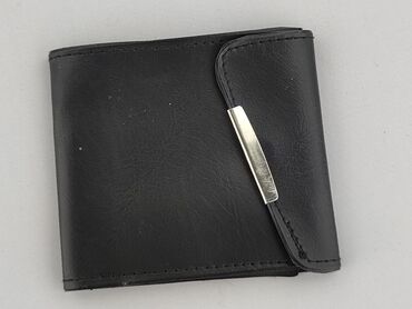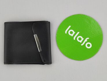 Męski portfel w kolorze czarnym, o kompaktowym formacie, zapinany klapką z elegancką, metalową wstawką z przodu. Najważniejsze cechy: - uniwersalny, klasyczny design – gładka faktura, czarne przes...Stan: