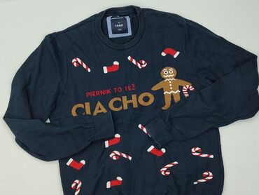 Sweter męski Carry Formal - Model: klasyczny sweter z okrągłym dekoltem (crewneck) - Rozmiar z metki: L - Kolor: granatowy - Fason: prosty, lekko dopasowany - Wykończenia: prążkowane ściągacze prz...Męski sweter świąteczny Carry, rozmiar M. Granatowy, z okrągłym dekoltem i ściągaczami przy mankietach oraz u dołu. Z przodu żakardowy motyw świąteczny: piernikowy ludzik z laską cukrową, czapki Mikołaja i cukierki oraz napis „PIERNIK TO TEŻ CIACHO”. Tył gładki. Miękka, dzianinowa tkanina przyjemna w noszeniu, odpowiednia na zimowe stylizacje i świąteczne okazje. Marka: Carry (inner collection, 19/91). Idealny jako zabawny element garderoby na okres świąteczny. Dla mężczyzny. Używany.