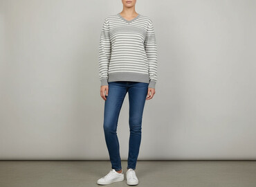 Kolorystyka neutralna sprawdzi się o każdej porze roku, a dekolt V optycznie wysmukla szyję i dobrze komponuje się z kołnierzykiem.