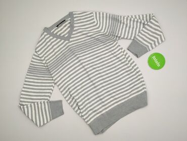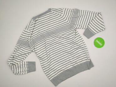 Sweter w paski z motywem gwiazdek - Fason: klasyczny sweter z okrągłym dekoltem - Wzór: poziome paski w odcieniach szarości i bieli; granatowe akcenty na mankietach i u dołu; na piersi trzy granat...