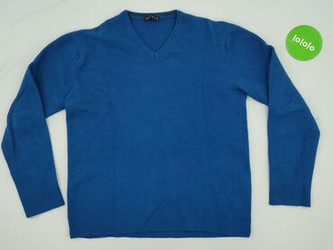Niebieski sweter P-M, rozmiar L/XL. - Fason: klasyczny, z okrągłym dekoltem (crew neck) - Długość rękawa: długi - Dzianina z dekoracyjnym, geometrycznym splotem z przodu - Ściągacze przy mankietac...