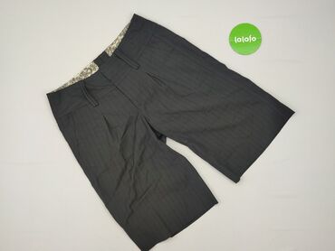 - Krój: bermudy o długości przed kolano; lekko wyższy stan z szerokim pasem i szlufkami na pasek; z przodu zakładki.