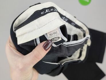 Czarne męskie spodnie garniturowe - Klasyczny, prosty krój z zaprasowanym kantem - Zapięcie na guzik i suwak, szlufki na pasek - Dwie kieszenie boczne (jedna z lamówką widoczna na zdjęciach), tyln...