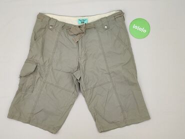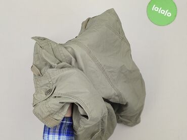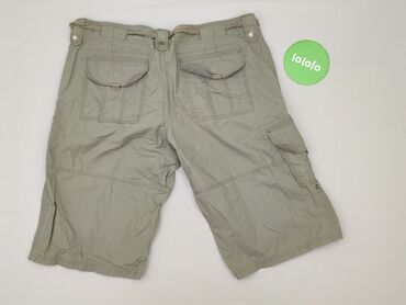Męskie szorty cargo w kolorze khaki - Rozmiar: M (na metce) - Materiał: 85% bawełna, 15% poliester - Pas: elastyczny z gumką, dodatkowe szlufki na pasek, zapięcie na guzik - Krój: luźny, długość d...