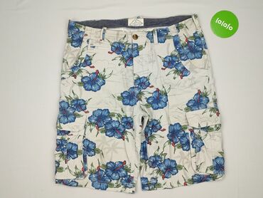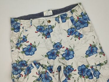 Męskie szorty cargo KappAhl – rozmiar 33 - Wzór: tropikalny, kwiaty i liście na granatowym tle - Krój: do kolan, z szerokimi szlufkami na pasek - Zapięcie: guzik i suwak - Kieszenie: - 2 kiesze...