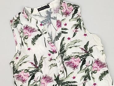 Bluzka damska Mohito, rozm. S - Krój: luźny T‑shirt z dekoltem w serek - Rękawy: krótkie, lekko bufiaste - Wzór: kwiatowy, odcienie różu i zieleni na jasnym tle - Materiał (zgodnie z metką): - p...Rozmiar: