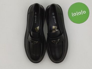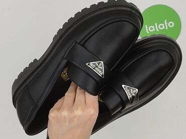 Damskie mokasyny w kolorze czarnym - Rozmiar: 40 (oznaczenie na podeszwie) - Klasyczny fason typu loafer - Cholewka z czarnej skóry/eko‑skóry o drobnej fakturze - Ozdobna, złota klamerka na pasku ...Stan: