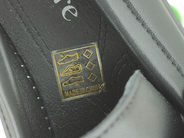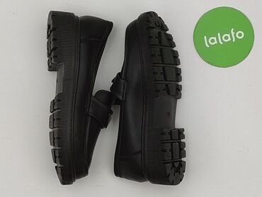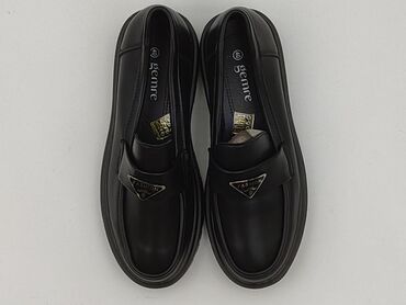 Damskie mokasyny w kolorze czarnym - Rozmiar: 40 (oznaczenie na podeszwie) - Klasyczny fason typu loafer - Cholewka z czarnej skóry/eko‑skóry o drobnej fakturze - Ozdobna, złota klamerka na pasku ...