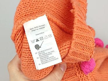 Puszysty sweter damski w intensywnym pomarańczowym kolorze - Krój: klasyczny, z długim rękawem - Dekolt: delikatnie zaokrąglony - Materiał: 50% nylon, 50% wiskoza (metka na zdjęciu) - Miękka, „fut...