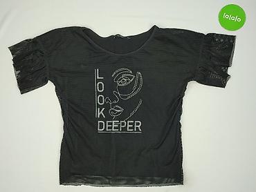 - Przód: aplikacja z błyszczących dżetów z napisem „LOOK DEEPER” i graficznym konturem twarzy