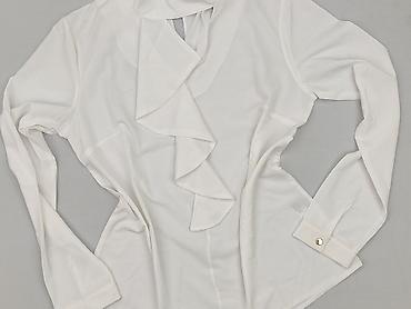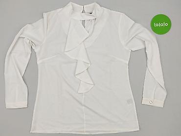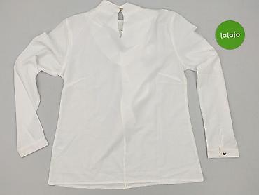 Biała damska bluzka Made in Italy, rozmiar M - Fason: luźny, lekko wydłużony tył (zaokrąglone wykończenie dołu), długi rękaw z szerokim mankietem - Kołnierzyk: klasyczny, ozdobiony subtelną lamówk...