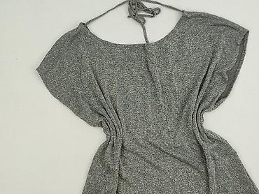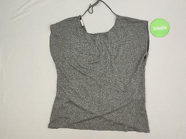 Szara bluzka damska z dzianiny, w poziome prążki ze srebrzystą, delikatnie połyskującą nitką. - Fason: prosty, lekko taliowany - Dekolt: okrągły - Rękaw: 3/4 - Wzór: drobne, regularne pasy - M...Stan: