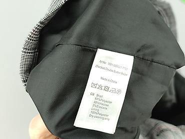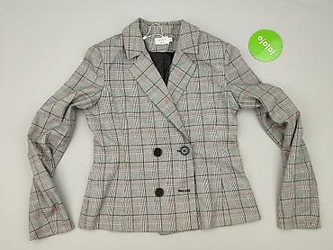 Marynarka damska w kratę (rozmiar M) - Krój: bez kołnierza, zapinana z przodu na 5 guzików - Wzór: klasyczna krata księcia Walii w odcieniach szarości z delikatną niebieską nitką - Materiał: 100% ...