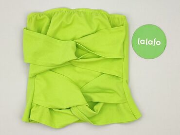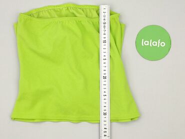 Top typu bandeau w intensywnie limonkowym kolorze. - Fason: bez ramiączek, dopasowany, długość do bioder - Dekolt: marszczony, z ozdobnym metalowym kółkiem na środku i zwisającym łańcuszkiem z prz...