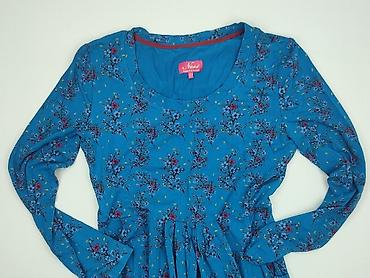 - Fason: rozkloszowany dół z delikatnymi zakładkami pod linią talii, długi rękaw, okrągły dekolt