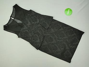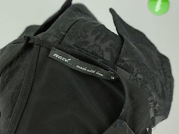 Czarna sukienka damska marki Next, rozmiar 14. Sukienka charakteryzuje się wzorzystym materiałem i fasonem z baskinką, co dodaje jej elegancji. Posiada dekolt w kształcie litery V z siateczkową wstawką, a także jest bez rękawów. Wykonana z mieszanki bawełny, poliestru i elastanu, co zapewnia komfort noszenia.