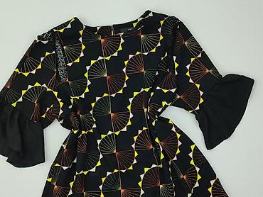 Ta bluzka damska marki Next wyróżnia się czarnym tłem z geometrycznym wzorem w kształcie wachlarzy w odcieniach żółci, pomarańczy i zieleni. Posiada krótkie, rozkloszowane rękawy z falbankami, które dodają jej lekkości. Wykonana jest z mieszanki poliestru i elastanu, co zapewnia komfort noszenia i dopasowanie. Idealna na co dzień oraz na specjalne okazje.