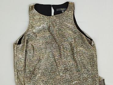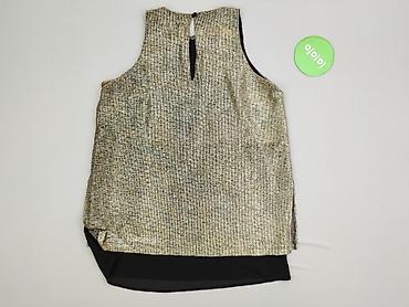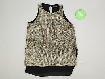 Top damski Next – bez rękawów, z połyskującą tkaniną w drobny, nieregularny wzór złoto‑srebrnej kratki. Model z okrągłym dekoltem, z tyłu łezka zapinana na guzik. Asymetryczny dół: z przodu krótszy, z tyłu wydłużony czarny panel z lekkiej, zwiewnej tkaniny, który tworzy efekt warstw. Obszycia przy pachach i dekolcie w kontrastowej czerni.