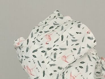 Bluzka damska z nadrukiem flamingów - Rozmiar: M (metka “M”) - Krój: koszulowy, przedłużony tył, dekolt w serek z krótką listwą, długie rękawy wiązane przy mankietach - Wzór/kolor: biała w gęsty n...