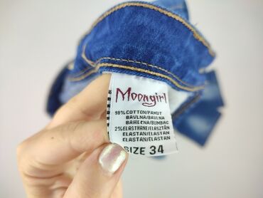 Damskie jeansy marki Moongirl w odcieniu niebieskiego, charakteryzujące się dopasowanym krojem slim fit. Spodnie posiadają klasyczne pięć kieszeni: dwie z przodu, dwie z tyłu oraz małą kieszonkę na monety. Zapięcie na zamek błyskawiczny i guzik zapewnia wygodę użytkowania. Jeansy wykonane są z tkaniny z przewagą bawełny z dodatkiem elastanu, co zapewnia komfort noszenia i elastyczność.