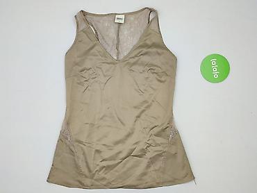 Beżowy top dzianinowy na ramiączkach, damski - Fason: dopasowany, z dekoltem w kształcie litery V z przodu i z tyłu - Rozmiar z metki: M - Kolor: jasny beż/owsiany - Dzianina gładka, elastyczna; w...