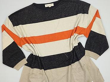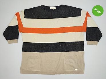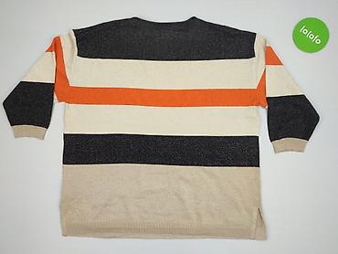 Sweter damski w pasy, rozmiar M - Krój: klasyczny, z okrągłym dekoltem - Wzór i kolory: poziome pasy w odcieniach szarości, kremu i brązu; drobne ażurowe prześwity między pasami - Materiał: 100% p...