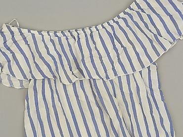 Bluzka damska hiszpanka, rozmiar S. - Krój: odkryte ramiona (off shoulder) z szeroką falbaną wokół dekoltu - Wzór: drobne, kolorowe kwiaty na białym tle w cienkie, pionowe paseczki - Rękaw: krótki...