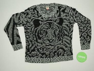 - Wzór: dzianinowy motyw tygrysa z przodu; czarno-szara melanżowa przędza, kontrastowe ściągacze przy dekolcie, mankietach i u dołu