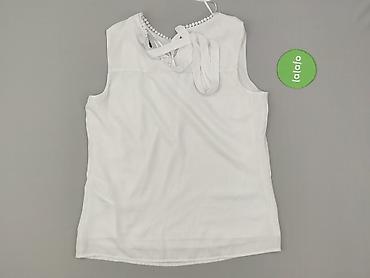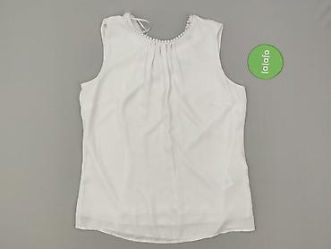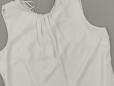 Biała damska bluzka bez rękawów Orsay, rozmiar S. - Krój: luźny, lekko wydłużony tył (asymetryczny dół), dekolt okrągły z ozdobną metalową wstawką i delikatnymi marszczeniami z przodu. - Materiały...
