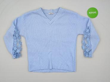 Delikatny, kobiecy sweter idealny na co dzień i na wyjścia – prążkowana dzianina ładnie się układa, a ażurowe, kwiatowe panele na rękawach dodają subtelnej elegancji. Dla kobiet. Używany.