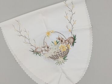 Obrus wielkanocny z nadrukiem - Kształt: prostokątny z delikatnie falistymi rogami - Kolorystyka: biały środek, żółta ramka; motywy w odcieniach żółci i zieleni - Wzór: zajączki, pisanki, kwiaty (...