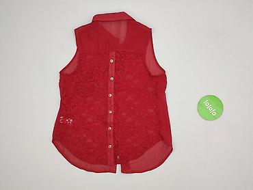 Bluzka bez rękawów Papaya, rozmiar M, kolor intensywnej czerwieni. Model koszulowy zapinany na guziki z przodu i z tyłu, z klasycznym kołnierzykiem. Przód z półtransparentnej tkaniny z delikatnym, koronkowym wzorem oraz kieszonką z koronki na lewej piersi. Tył w całości z efektownej, gęstej koronki o kwiatowym motywie. Dół zaokrąglony.