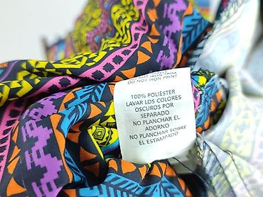 - Metki z instrukcją pielęgnacji (prać ciemne kolory oddzielnie, nie prasować nadruku)