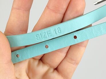 Pasek damski w kolorze jasnej szałwii/mięty. - Szerokość: ok. 4,5 cm (szeroki, podkreślający talię) - Długość całkowita: ok. 90 cm (na zdjęciu z linijką) - Klamra: prostokątna, szeroka, w tym samy...Pasek damski w kolorze miętowym (turkusowy pastel). Wykonany z gładkiego, półpołyskującego materiału syntetycznego. Klasyczna klamerka w kolorze srebrnym, szlufka i kilka dziurek regulacyjnych. Na wewnętrznej stronie oznaczenie SIZE 18. Smukły, wąski fason – idealny do sukienek, spódnic i spodni z wysokim stanem lub do przewiązania w talii jako akcent kolorystyczny.