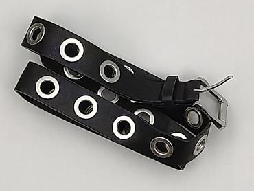 - Materiał: czarny pasek ze skóry/eko‑skóry z dużymi, metalowymi oczkami na całej długości