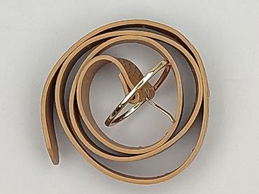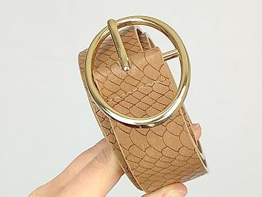 Damski pasek w kolorze beżowym/karmelowym z ozdobną klamrą. - Smukły, wąski fason – idealny do sukienek, spódnic i spodni z wysokim stanem. - Klamra w kolorze złota, owalna, bogato zdobiona przezro...