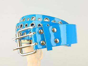 Pasek damski, niebieski, lakierowany z podwójną klamrą - Styl: rock/glam, wyrazisty połysk - Kolor: intensywny niebieski (front lakierowany), spód jasny - Zapięcie: solidna, metalowa podwójna klam...Płeć: