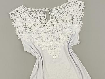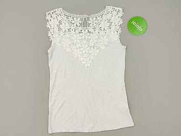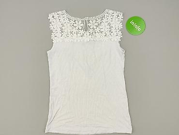 Biała damska bluzka bez rękawów z koronką - Fason: lekko luźny, bez rękawów - Dekolt: w kształcie litery V - Tył i dół wykończone ażurową koronką o kwiatowym wzorze; delikatnie przedłużony tył - P...Stan: