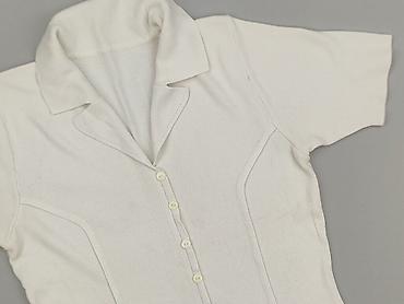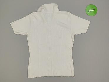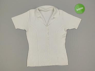 Biała bluzka z krótkim rękawem i delikatną stójką. - Materiał: prążkowana dzianina 65% poliester, 35% bawełna (etykieta na zdjęciu). - Kolor: biały, jednolity. - Krój: dopasowany, elastyczny; kr...