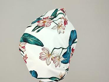 - Wzór: tropikalny, białe tło z dużymi zielonymi liśćmi i kwiatami w odcieniach różu oraz czerwieni.