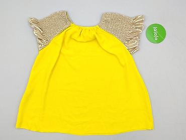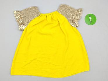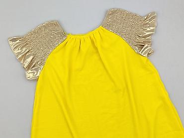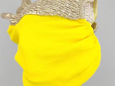 - Rękawy: krótkie, falbaniaste z połyskującej, złotej tkaniny; karczek/rękawy elastyczne, marszczone