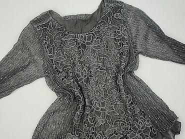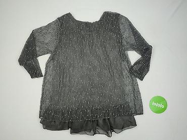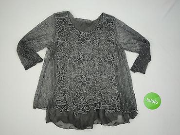 Bluzka damska z lekkiej, półprzezroczystej dzianiny w odcieniach szarości z roślinnym, drobnym wzorem. - Krój: luźny, tunikowy - Dekolt: okrągły z delikatnym marszczeniem i troczkiem do regulacji ...