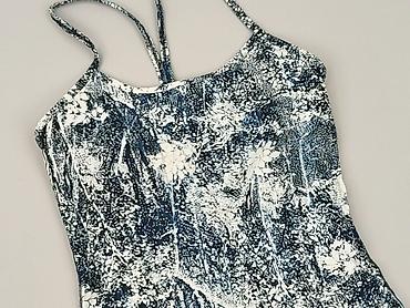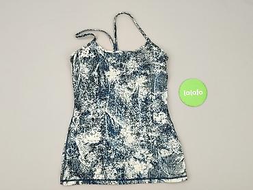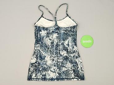 Damska koszulka bez rękawów z dzianiny, w drobny kwiatowy wzór (granatowe tło, białe kwiatuszki). - Krój: prosty, swobodny, bez rękawów - Dekolt: okrągły - Dół regulowany troczkami po lewej stroni...
