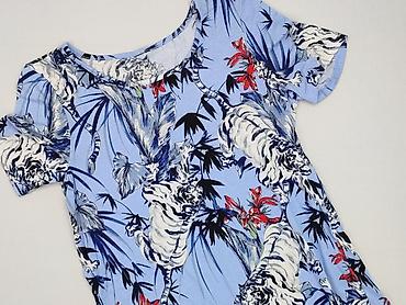 Bluzka damska z krótkim rękawem, w tropikalny wzór - Krój: luźny, komfortowy; lekko dłuższy tył - Dekolt: okrągły z małym wycięciem/szczeliną z tyłu - Rękawy: krótkie, lekko podwinięte - Wzór: kwi...