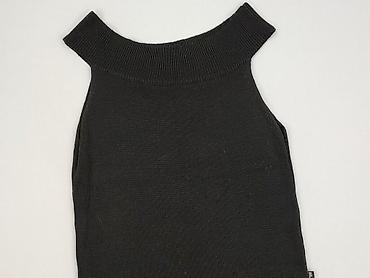 Czarny top bez rękawów typu halter dla kobiety. Dzianinowy, elastyczny, o gęstym splocie. Szeroki, prążkowany pas przy dekolcie tworzy charakterystyczny krój odsłaniający ramiona. Prosty dół z delikatnym podwinięciem. Gładki, jednolity kolor, bez nadruków. Miękki materiał dobrze dopasowuje się do sylwetki i ładnie się układa.