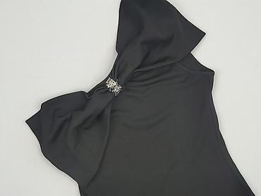 Czarny top damski na jedno ramię z dużą, efektowną falbaną/kimono na lewym ramieniu. Ramię zdobi ozdobna aplikacja z błyszczących kryształków, która marszczy materiał i tworzy dekoracyjną „kokardę”. Krój dopasowany, długość do bioder. Gładka, elastyczna tkanina o satynowym połysku, przyjemna w dotyku i dobrze układająca się na sylwetce. Dekolt asymetryczny, drugie ramię na cienkim ramiączku. Idealna propozycja na wieczór, imprezę lub eleganckie wyjście; łatwo łączy się ze spódnicą ołówkową, cygaretkami lub jeansami. Kolor: czarny. Dla kobiet. Używana.